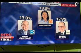 En el tercer lugar se ubica Ricardo Belmont con 12.9%, muy cerca de López Aliaga. La estrecha diferencia mantiene abierto el escenario por el segundo puesto, a la espera de resultados oficiales.